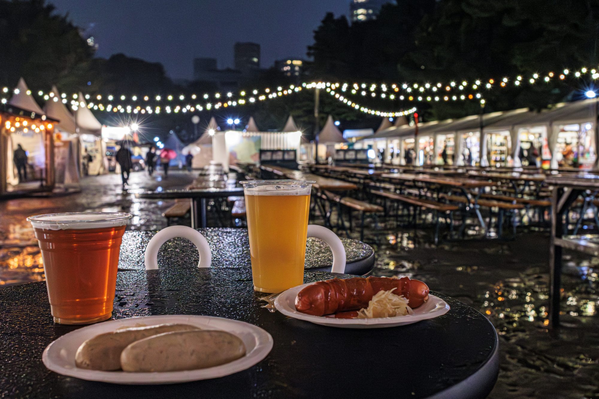審査員コメント 「初日は生憎の雨降りでしたが、雨と夜がつくるシックな雰囲気の中、鮮やかな電飾と美味しそうなビールが一層きらめいて映えています」
