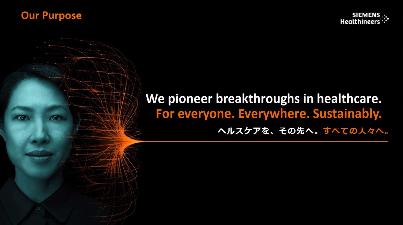 Siemens Healthineersは、ドイツ・エアランゲンを本拠とし、世界70ヵ国以上に拠点を置くメドテックカンパニーです。「We pioneer breakthroughs in healthcare. For everyone. Everywhere. Sustainably. ヘルスケアを、その先へ。すべての人々へ。」というPurposeのもと、CT、MRI、マンモグラフィなどをはじめとする画像診断装置や、免疫や生化学検査のための体外診断薬・検査装置、画像ガイド下治療や革新的ながん医療のための医療機器を提供しています。また、医療従事者の方々が高品質で効率的なケアを提供できるよう、デジタルヘルスケアサービスや病院経営に関するソリューションも積極的に拡充しています。2023年9月末までの2023年度における全世界の売上は約217億ユーロ。全世界で約7万人の社員が活躍しています。 |